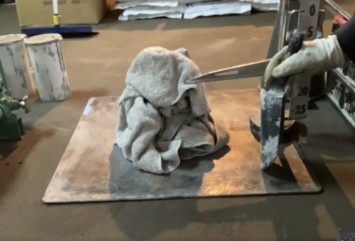 スランプ試験では、タオルをコンクリートに見立てて